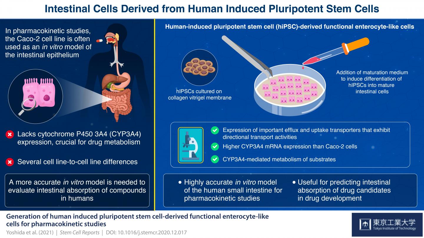 To tackle these problems, scientists from the Tokyo Institute of Technology, The University of Tokyo, Kanto Chemical Co. Inc., Shionogi & Co., Ltd. and Shionogi TechnoAdvance Research Co., Ltd., developed novel enterocyte-like cells from human-induced pluripotent stem cells (hiPSCs), which can differentiate into any type of cell when provided with right growth factors.