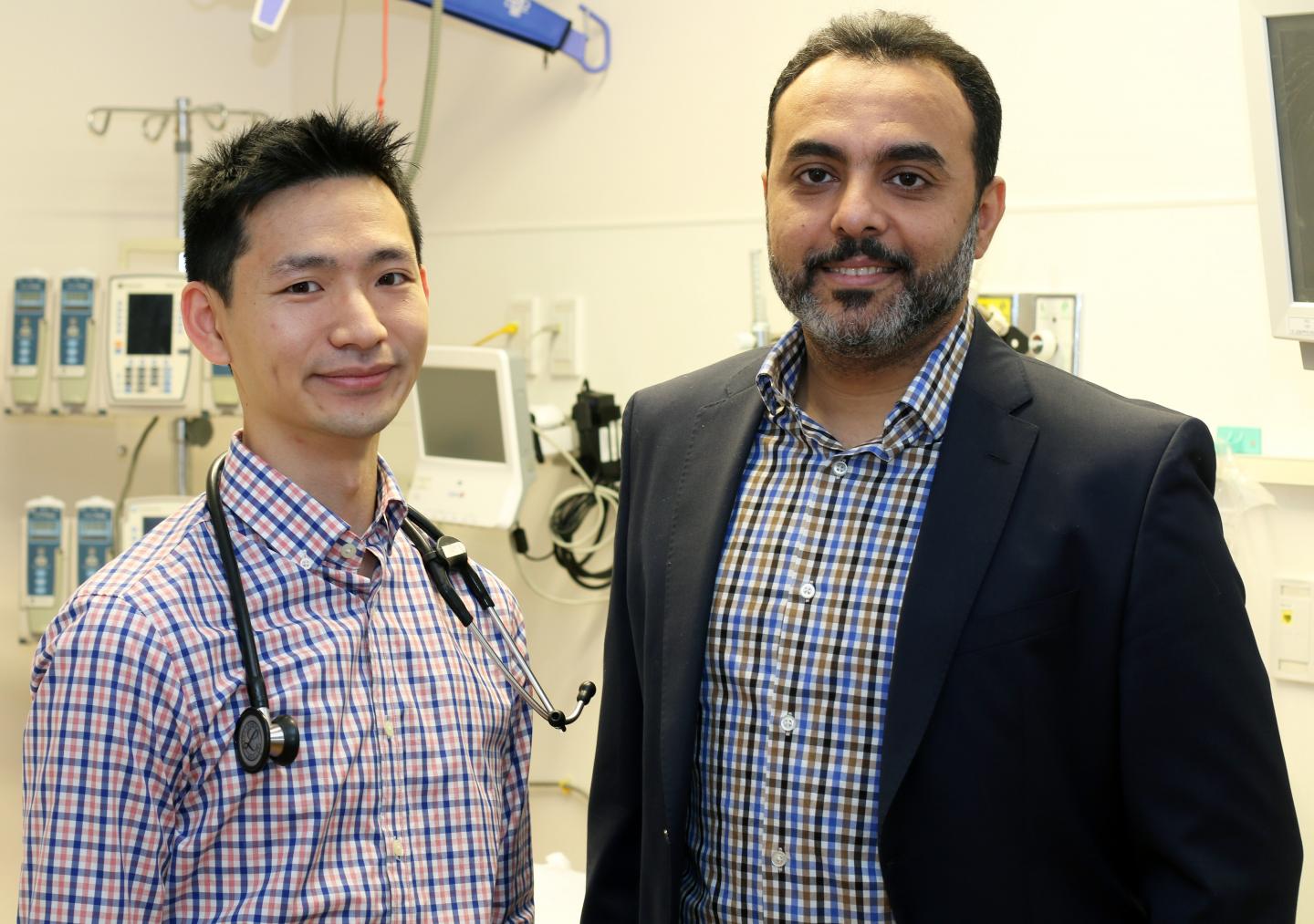 image: Derek Chu, left, McMaster University clinical fellow, and Waleed Alhazzani, assistant professor of medicine at McMaster, led a study published in The Lancet on oxygen use in adult patients. Photo courtesy McMaster University.