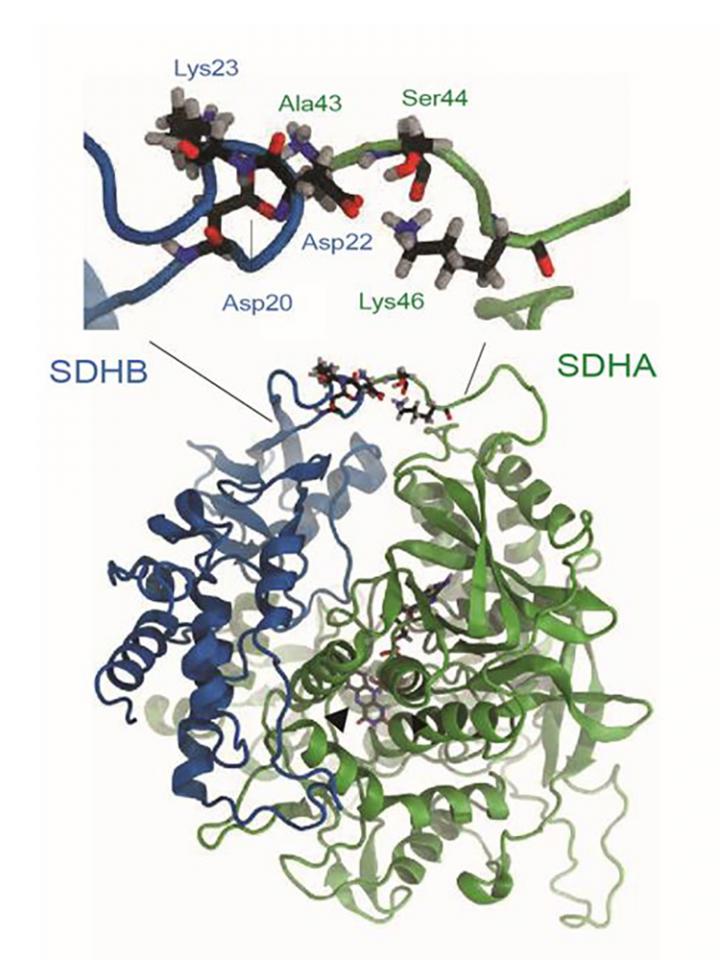 image: A typical interaction between the A45T mutated SDHA gene (green) and the SDHB gene (blue) -- it increases the functioning of the whole complex and thereby triggers inflammation signals in the affected immune cells.