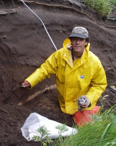 Ben Fitzhugh, an associate professor of anthropology at the University of Washington, collects charcoal samples to be used for radiocarbon dating of different layers of an eroding archaeological site in the Kurils.