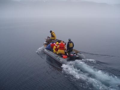 The Kuril Islands are among the foggiest places on earth. Here the research team approaches Shiashkotan, one of the Kuril Islands.