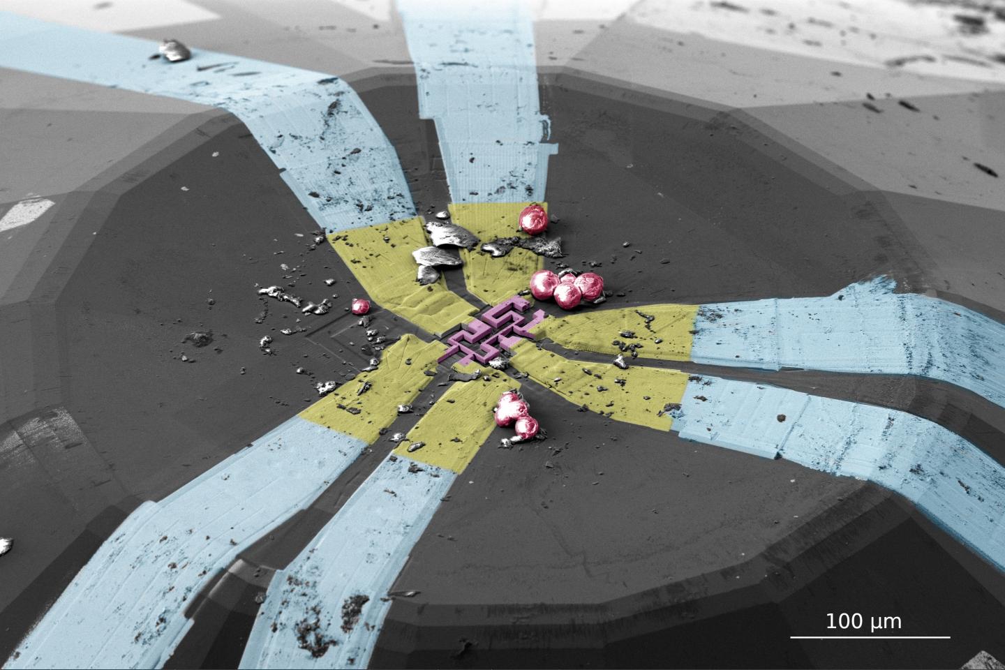 image: False-color electron microscopic image of a microstructure (violet) contacted via gold tracks (yellow) after reopening the diamond anvil cell. Ruby spheres (red) are used to sense the pressure in the sample chamber via laser fluorescence spectroscopy. Debris particles are remnants of the pressure medium and pressure device.