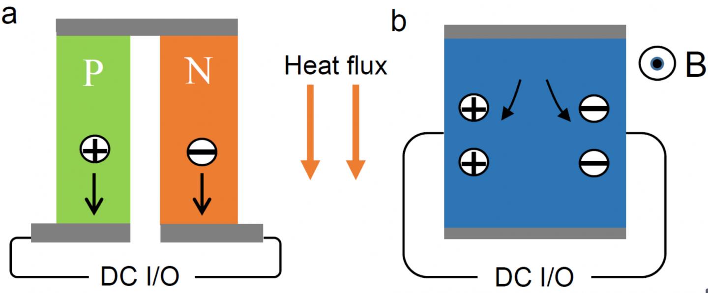 image: Schematics of longitudinal (a) and transverse (b) thermoelectric modules. While n and p type materials are needed for the longitudinal thermoelectric module, one material with compensated electrons and holes suffices in the transverse case.