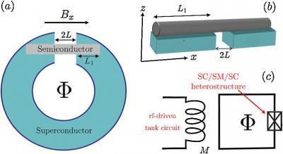 Picture of the prospective experimental setup in which Majorana particles could be made in a hybrid superconductor-nanowire material. In (a) the topological semiconductor bridges a gap between two parts of a superconductor. The letter phi represents an external magnetic field which can tailor conditions in the semiconductor. In (b) the immediate nanowire (gray rod) environment is shown. L is the size of the gap between the superconductor halves while L1 is the distance over which the underlying superconductivity will persist within the overlying semiconductor. (c) shows how the superconductor (SC)-semiconductor (SM) sandwich can be further tuned by a nearby electrical circuit.