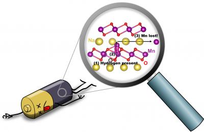 image: An illustration depicts hydrogen-induced degradation of a sodium-ion battery: (1) When hydrogen is present (circled in black), (2) an Mn atom (purple) can move from the MnO2 layer to the Na layer (yellow); (3) Mn can then move within the Na layer, and will be lost.