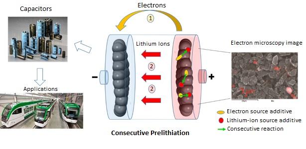 Researchers from l'Institut des matériaux Jean Rouxel [1] (CNRS/Université de Nantes), in collaboration with Münster Electrochemical Energy Technology (University of Münster), met this challenge by using not just one but two additives coupled through consecutive chemical reactions. Their analysis shows that the primary barrier for earlier approaches was their use of a single additive, which had to not only provide lithium ions and electrons, but also meet all of the conditions of price, chemical stability, and performance. The use of two additives each with a specific role, with one providing lithium ions and the other electrons, offers much greater latitude, for they can be selected independently for their price, chemical properties, and performance. When a lithium-ion capacitor is charging, the first additive (pyrene, naturally present in certain types of coal) releases electrons and protons. The second additive, Li3PO4 (mass produced in the glass industry, for instance), captures these protons, and in turn releases lithium ions that are then available for prelithiation.