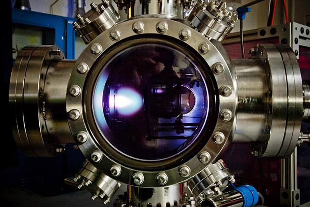 image: To make the new material, the thin film is first deposited via a pulsed-laser deposition process in this chamber. The bright "plume" you see is the laser hitting the target and depositing the material.