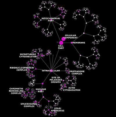 This image shows the hierarchical ontology of genes, cellular components and processes derived from large genomic datasets.