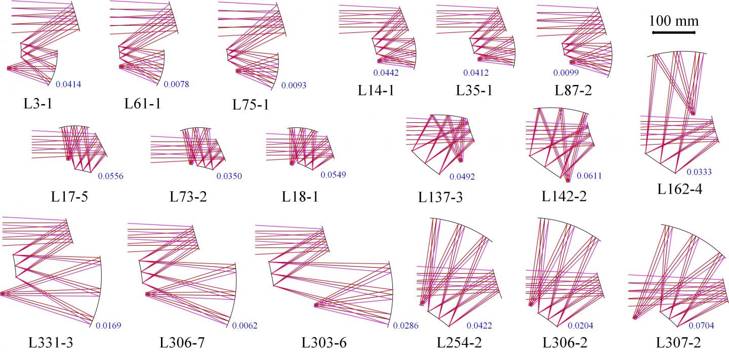 image: The first design example is a three-mirror freeform imaging system that has a field-of-view of 8°×6°, a focal length of 50 mm and a F-number of 1.8, which works in the LWIR band. The computing task is deployed on the high-performance computing platform in Tsinghua University. Through 41.8 hours of automatic computation, 127 systems are obtained, all of which have the average RMS wavefront error (AVG WFE RMS) smaller than 0.075λ (λ = 10 μm). The imaging quality is considered to be diffraction-limited or near-diffraction-limited.