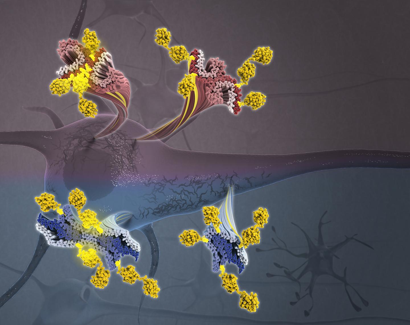 image: Tau aggregation into insoluble filaments is the defining pathological hallmark of tauopathies. Arakhamia et al. use cryo-electron microscopy and mass spectrometry to compare the structures of tau filaments from corticobasal degeneration and Alzheimer's disease, identifying the importance of posttranslational modifications in mediating the structural diversity of tauopathy strains. Above: Tau filaments decorated with ubiquitin chains (yellow) from corticobasal degeneration (blue/navy) and Alzheimer's disease (red/purple) emanating from a neuron.