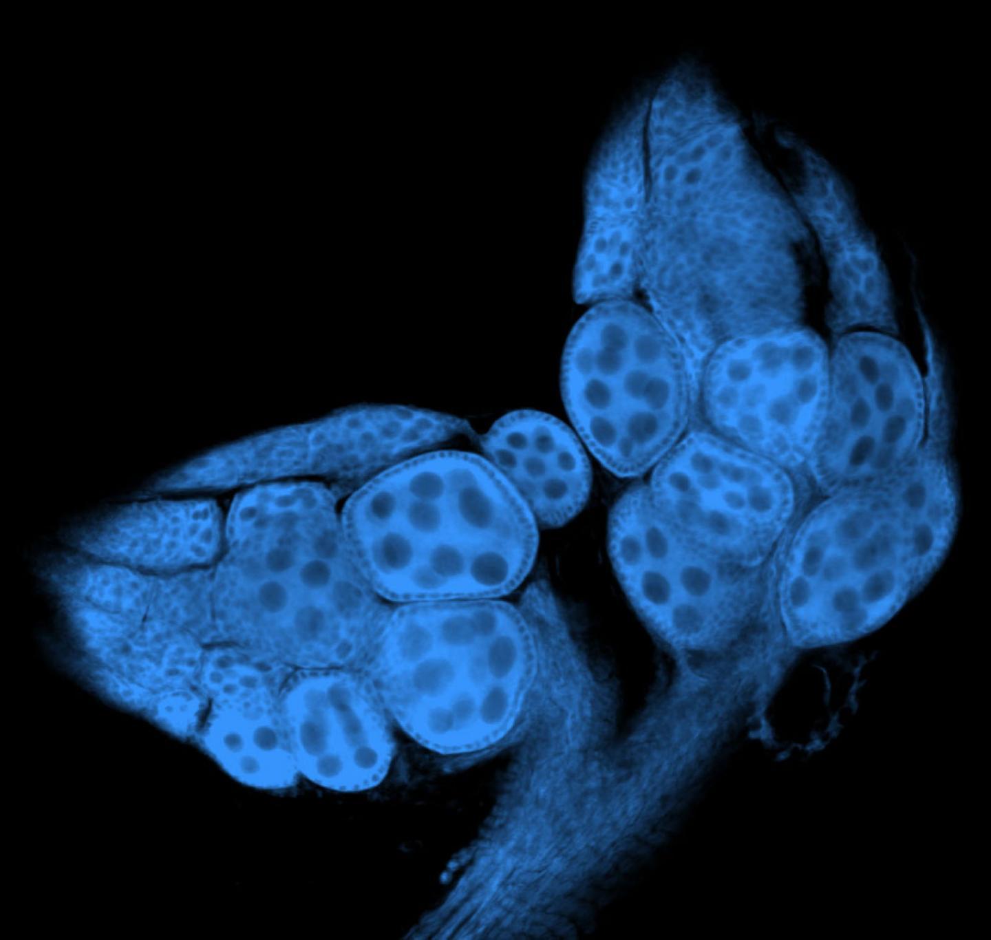 This is the ovary (specifically stained) of a female Drosophila sechellia fruit fly raised outside its host. Without L-DOPA in its food, oogenesis is halted.