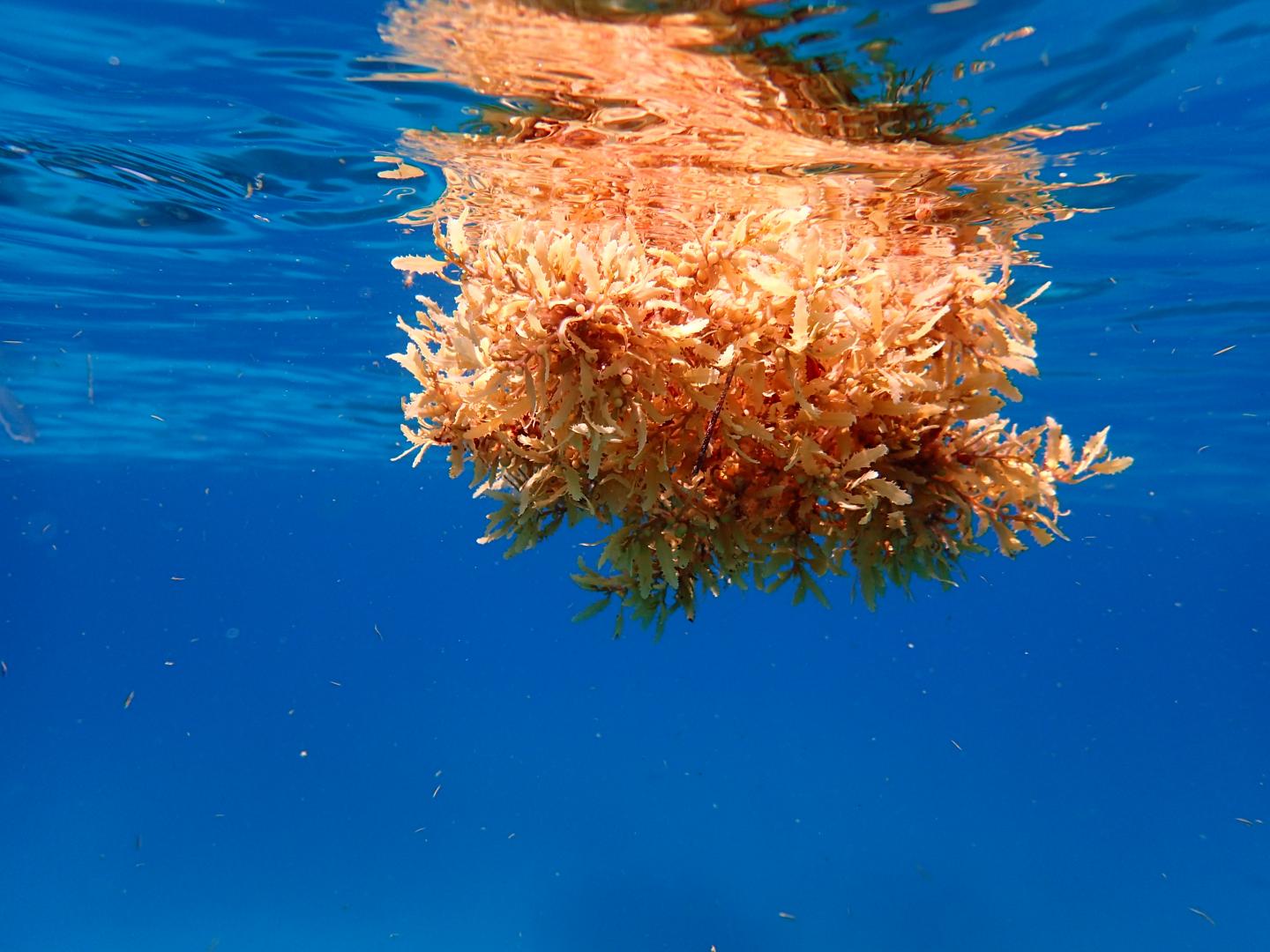 Sargassum is actually a floating seaweed that drifts on ocean currents in the Atlantic Ocean, Caribbean, and Gulf of Mexico. It is unusual because it's the only seaweed in the world that never spends any part of its life cycle attached to the bottom. Sometimes called a golden floating rainforest, clumps of Sargassum--ranging in size from a softball to floating rafts miles long--are their own ecosystem.
