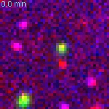 video: MoonTag (blue) and SunTag (green) translation on different single mRNA molecules (red dots) in living cells.