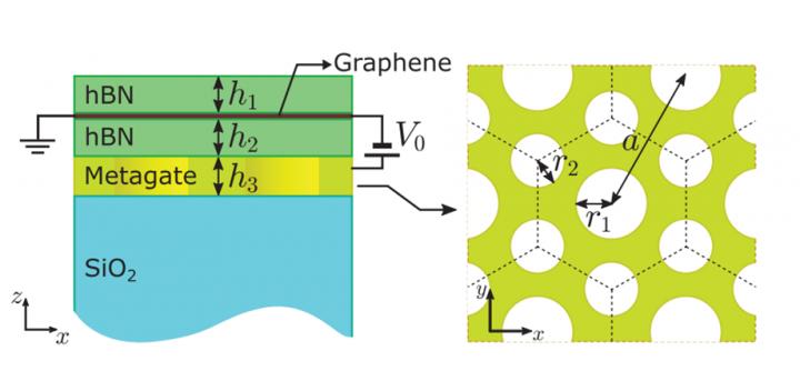 image: (Left) Schematic of the graphene platform used. Graphene is sandwiched between two layers of hexagonal boron nitride layers, and these are layered on top of a metagate layer. (Right) Structure of the metagate. The interface between metagates with different hole radii acts as a topological region that confines certain forms of light. doi 10.1117/1.AP.2.4.046003
