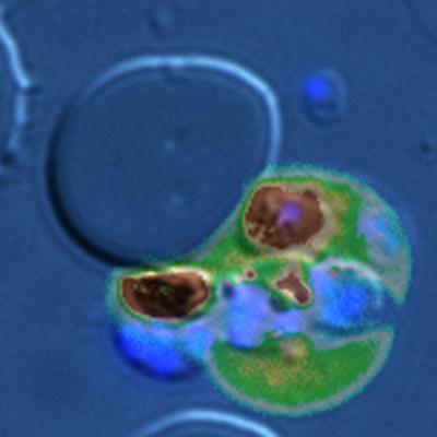 A P. falciparum parasite exits a host erythrocyte loaded with the calcium concentration indicator. High fluorescence of the calcium indicator indicates increased calcium concentration within the host cell. The image is pseudocolored, tending from black (the lowest calcium concentration), through green and yellow to red (the highest calcium concentration) to indicate relative calcium concentration within the host cell. Increased calcium induces calpain activation at the time of parasite egress, as a consequence of upstream host cell signaling. The nuclei of daughter parasites are stained blue in a diagonal pattern from the upper right to the lower left as the parasites are actively exiting the cell. The host cell is no longer uniformly circular since it has been lysed. This shows a high concentration of calcium within the host cell at the end of the parasite cycle, when the host cell lyses and necessary for host calpain activation and break down of the host cytoskeleton.
