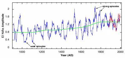 This graph shows El Niño amplitude derived from North American tree rings (blue) and instrumental measurements (red). The green curve represents the long-term trend in El Nino strength. (Individual El Niño events occur typically at intervals of 2-7 years.) Periods of strong El Niño activity are indicated by amplitudes above 1.0. Superimposed on a general rising trend, cycles of strong activity occurred about every 50-90 years.