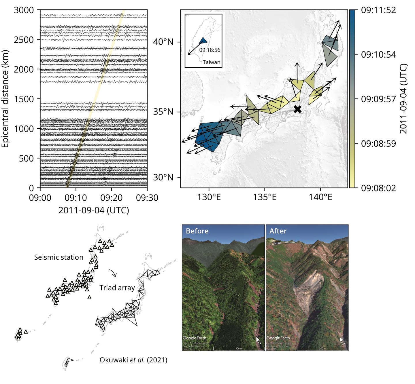 image: (Upper panel) Observed seismic waveforms propagating from the landslide source. Map shows the observed arrival angles and arrival times from the landslide. (Lower panel) Observation design. We make triad sub-array networks from the existing seismic networks. Map shows the satellite images before and after the landslide.