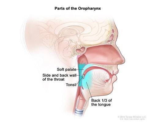 image: A lump in the neck and a sore throat are the most common signs of oropharynx cancer, a disease in which cancer cells form in the tissues of the oropharynx--the middle part of the throat (pharynx), at the base of the tongue and tonsils. About 60% of oropharynx cancers are associated with HPV infection.