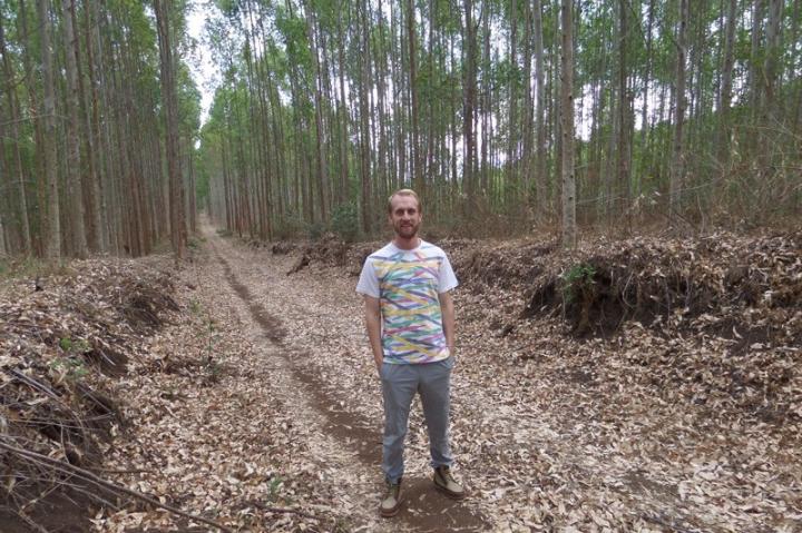 image: UD Assistant Professor Kyle Davis has published a new study that looks at which types of large-scale land investments may be associated with increases in tropical deforestation. Davis is pictured here doing fieldwork in central Mozambique when members of the research group were visiting forest concessions and large-scale agricultural investments. This particular photo is from inside a Eucalyptus plantation.