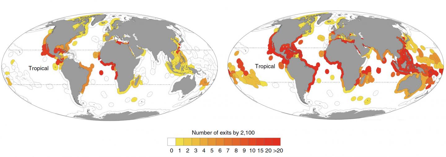 The model showed that, under a moderate emissions scenario, tropical countries could lose 15% of their fish species by the year 2100. If a more high-end emissions scenario were to occur, they could lose more than 40% of their 2012 species.
