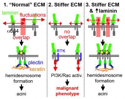 The Harvard researchers proposed a mechanism to explain how the stiffness and composition of the extracellular matrix could activate signaling pathways that produce a malignant phenotype. In normal conditions (left column), membrane components can fluctuate, overlap, and cluster, forming hemidesmosomes. In a stiffer matrix, they are unable to do so (center). The problem can be corrected in vitro by increasing the concentration of laminin (right).