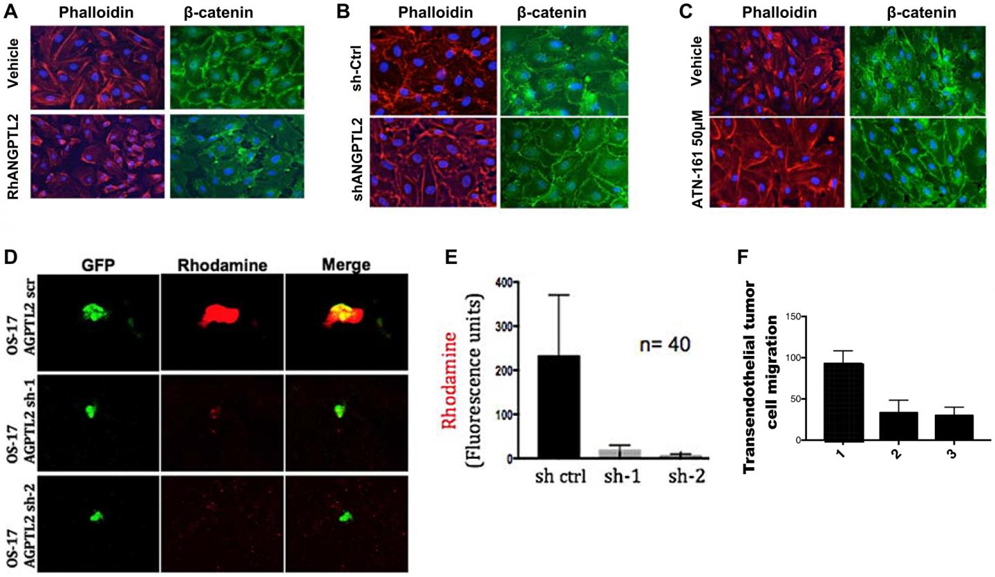 image: Tumor-secreted ANGPTL2 promotes osteosarcoma metastasis by mediating endothelial monolayer disruption, lung capillary permeability, and trans-endothelial tumor cell migration. (A) HUVEC monolayers were grown to confluence on fibronectin-coated slides and then treated with either vehicle (PBS) or human recombinant ANGPTL2 protein (rhANGPTL2) for 24h. Slides were subsequently fluorescently stained with anti-phalloidin, and anti-β-catenin antibody. (B) HUVEC monolayers were treated for 24 h with media conditioned by control OS17 osteosarcoma cells that express ANGPTL2 (ctrl) or knockdown OS17-shANGPTL2 (sh) cells. Samples were stained for β-catenin and phalloidin. (C) Administration of ANGPTL2 receptor inhibitor, ATN-161, prevents disruption of vascular endothelial cell-cell junctions. HUVEC monolayers were treated for 24 h with media conditioned by OS-17 cells in the presence of drug. Subsequently, samples were stained for β-catenin and phalloidin. ((A-B) Quantitative analysis of paracellular gap formation is shown in Supplementary Figure 7) (D) GFP-labeled indicated OS17 cells were injected via the tail vein and allowed to lodge in the lungs. One day post injection, a rhodamine-dextran dye was injected into circulation. Three hours after dye injection, lungs were extracted and frozen sections were obtained. Representative confocal images are shown here of cells with and without accumulation of dye in the lung parenchyma. (E) Images were obtained as described in (D) with control or ANGPTL2 knockdown OS17 cells. A region of interest was drawn around the GFP-labeled cells and the amount of dextran dye was quantified based on rhodamine emissions. n = 40 cells; error bars indicate s. e. m; p-values calculated using the one-tailed unpaired t-test. (F) OS17-shCtr (1), OS17-sh1ANGPTL2 (2) or OS17-sh2ANGPTL2 (3) were seeded into trans-well inserts that were previously covered with a HUVEC monolayer. Cells that migrated cross the endothelial layer into the bottom side of the transwell membrane were quantified with Volocity software. n = 15, error bars indicate s. e. m; p-values calculated using the one-tailed unpaired t-test.