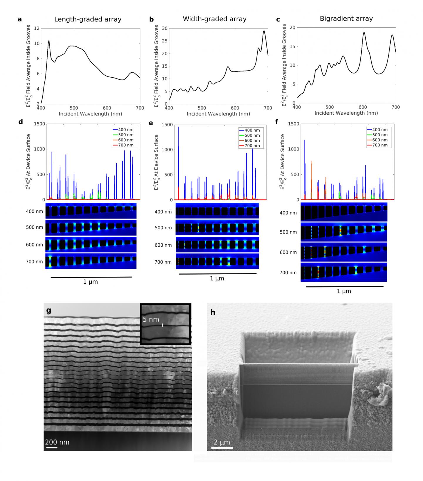 image: Spectral (a-c) and spatial (d-f) field profiles of groove arrays with gradients in (a,d) groove-length, (b,e) groove-width and (c,f) both groove-length and groove width. Each gradient design produces broadband field enhancement with the spatial and spectral profiles determined by the geometries of the comprising grooves. (g-h) SEM images of the nanoscale metal-dielectric-metal grooves with a minimum groove width of 5 nm, allowing for extreme light concentration.