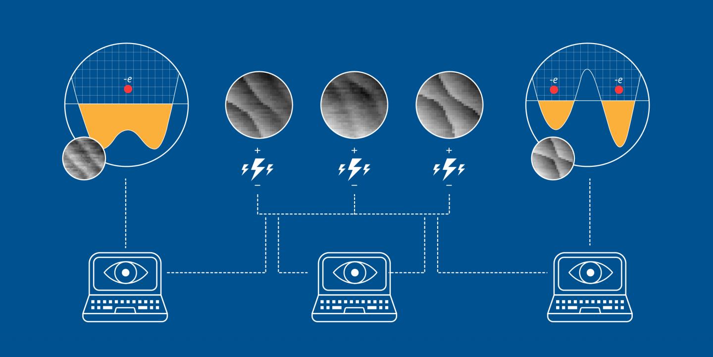 image: This artist's conception shows how the research team used artificial intelligence (AI) and other computational techniques to tune a quantum dot device for use as a qubit. The dot's electrons are corralled by electrical gates, whose adjustable voltages raise and lower the "peaks" and "valleys" in the large circles. As the gates push the electrons around, sensitive measurement of the moving electrons creates telltale lines in the black and white images, which the AI uses to judge the state of the dot and then make successive adjustments to the gate voltages. Eventually the AI converts a single dot (leftmost large circle) to a double dot (rightmost), a process that takes tedious hours for a human operator.