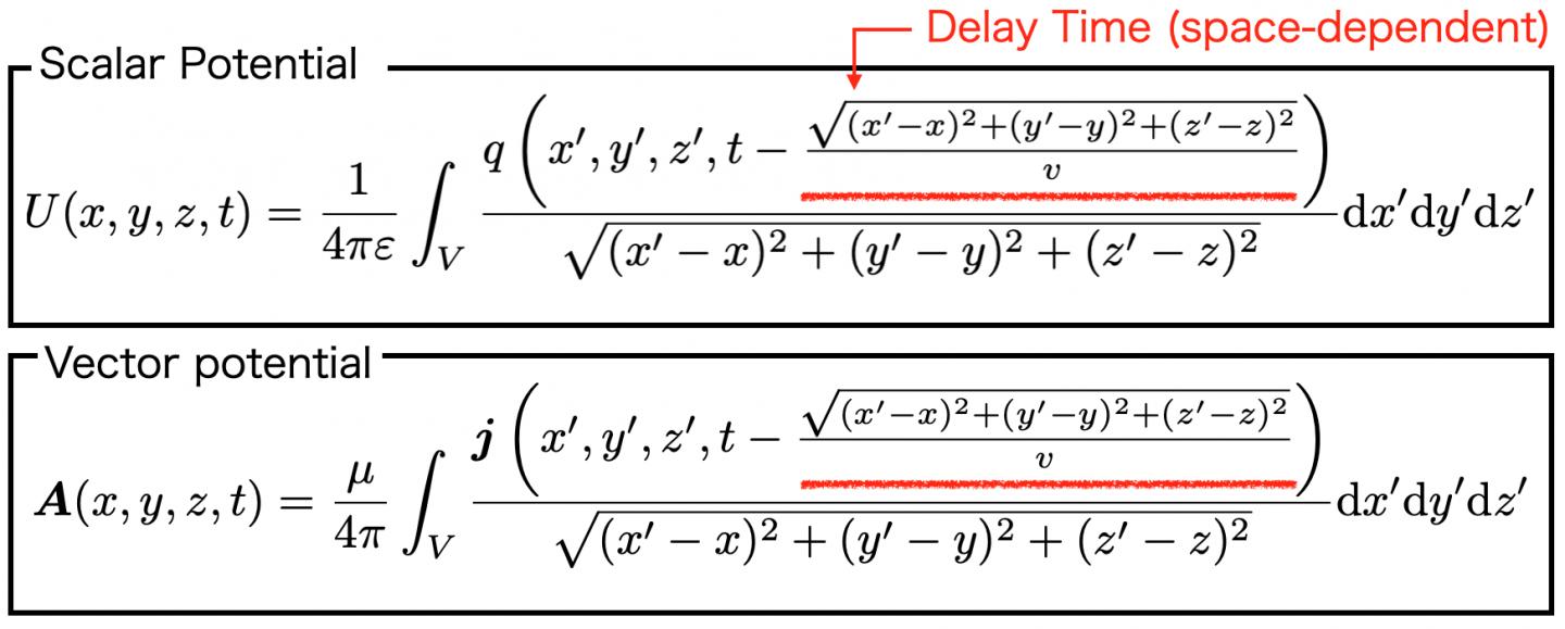 As delay time needs to be taken into account to consider external radiation, U and A are affected by the charge density q and current density j, which have some delay times that depend on space. Thus, to precisely consider the delay, it is necessary to perform a complex spatial integration calculation with a time shift.