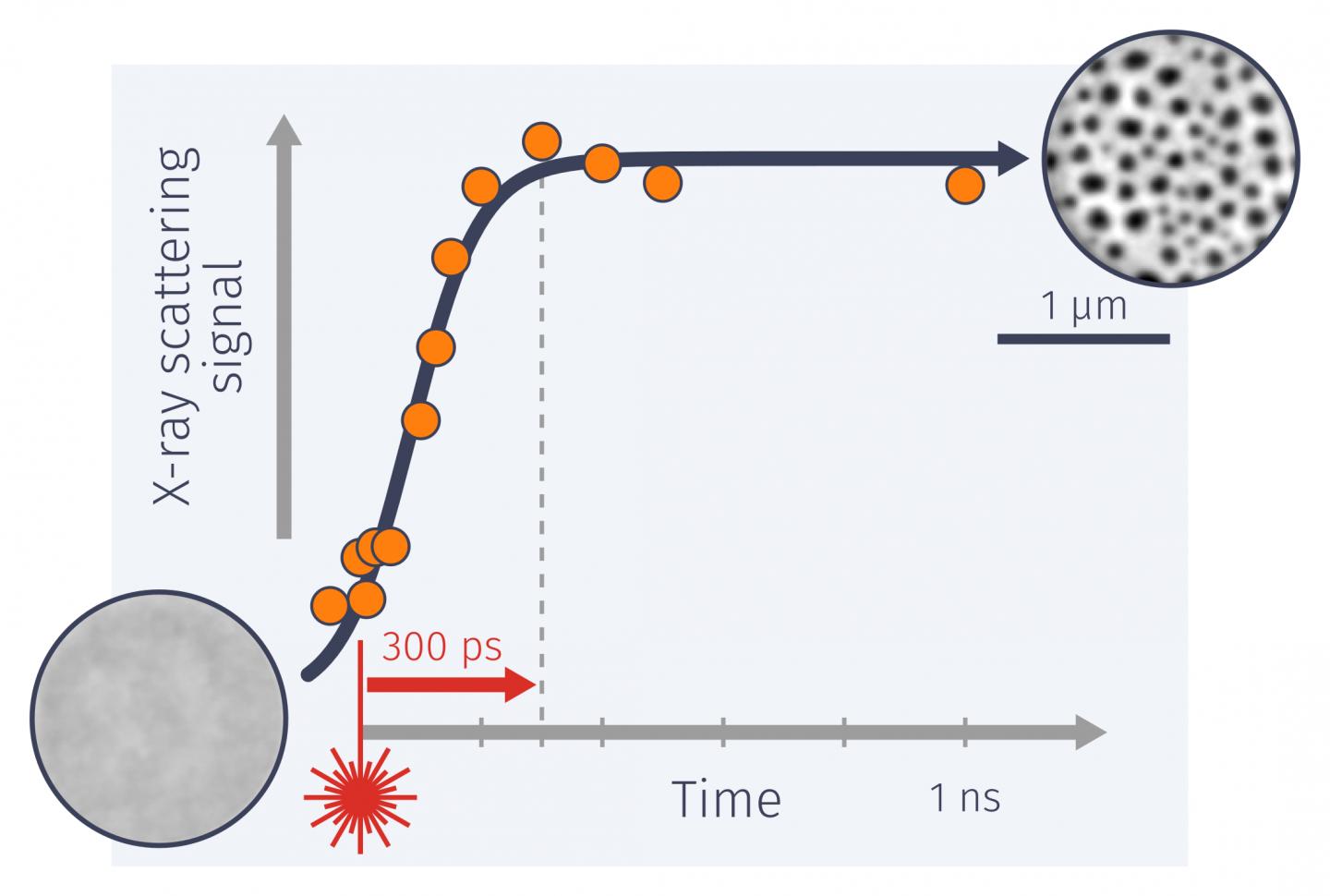 image: The x-ray scattering signal from a thin magnetic film increases after it was hit by a laser pulse, monitoring the formation of skyrmions. After 300 picoseconds the topological transformation is finished and skyrmions were created. The x-ray microscopy images show the magnetic patterns in the thin film before (left) and after (right) the laser pulse hit the film. The skyrmions are identified with the black dots and have a size of 70 nanometers on average.
