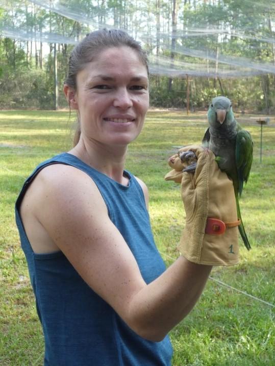 image: UC researcher Annemarie van der Marel holds a captive monk parakeet she is studying.