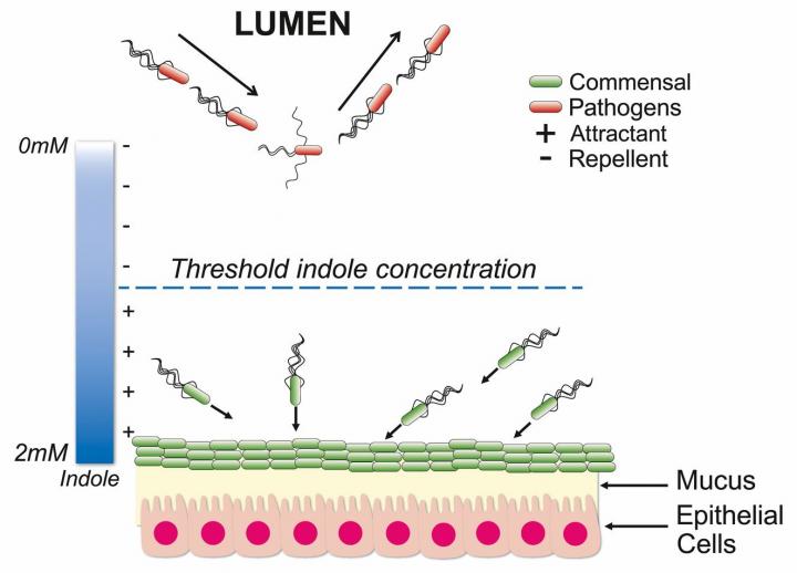 Since the bacteria that produce indole in the gut typically are enmeshed in mucus layers among other bacteria, the indole concentration drops as one gets further away from the source of indole. Since pathogens tend to pass through the gut relatively far from the bacteria that produce indole, they are not likely to encounter high concentrations of indole for a sustained period. Therefore, they are not sensitized to indole, and any indole they encounter repels them.