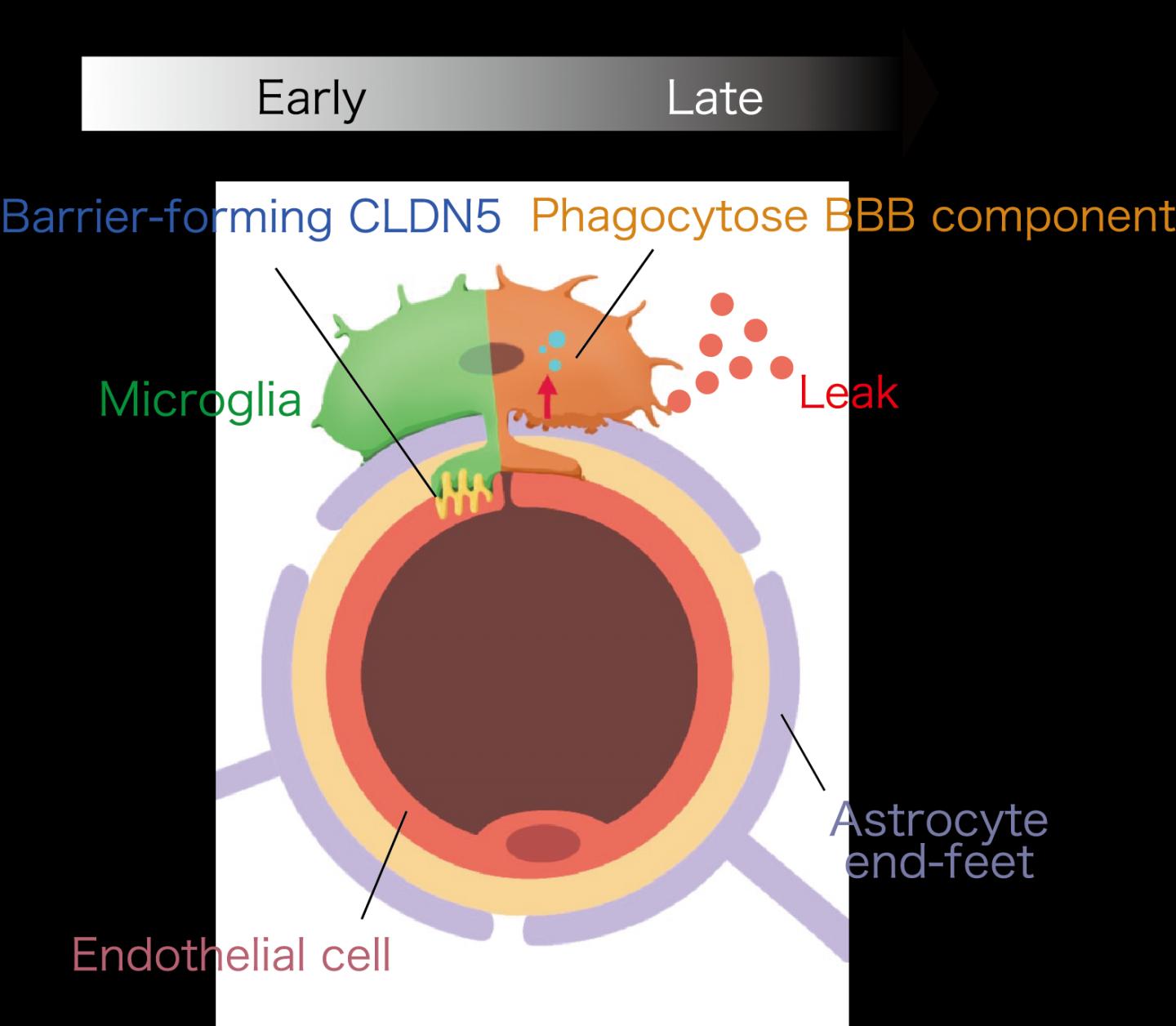 image: Microglia express tight junction molecule (CLDN5) to maintain BBB integrity in early phase and molecule for phagocytosis (CD68) to impair the BBB function in late phase of systemic inflammation. Microglia phagocytose astrocyte end feet which is one of the components of BBB.