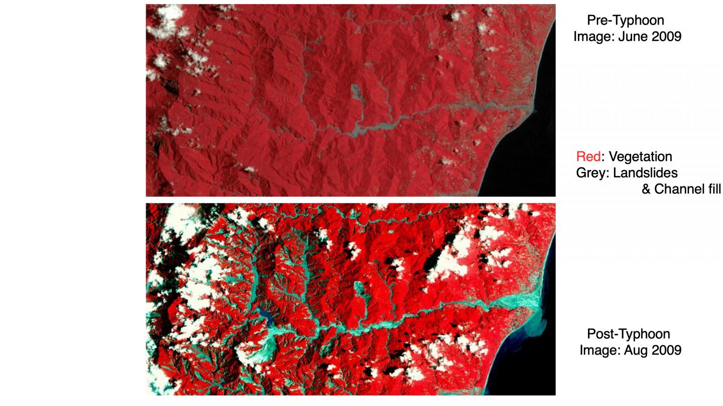 image: Images from a satellite (LANDSAT) show massive erosion after the typhoon Morakot hit Taiwan. This influenced seismicity in the affected regions.