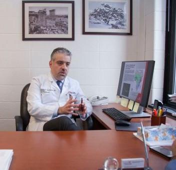 image: Dr. Bassam Abu Jawdeh at his desk, discussing the APOL1 gene study published in the American Journal of Nephrology.