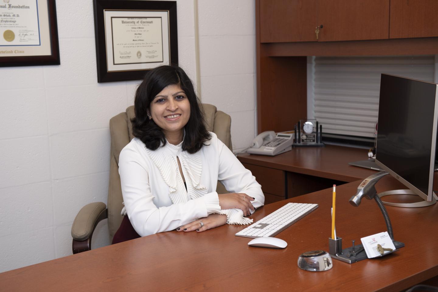 image: Silvi Shah, MD, assistant professor in the University of Cincinnati Division of Nephrology, Kidney CARE Program sitting at her desk in the College of Medicine