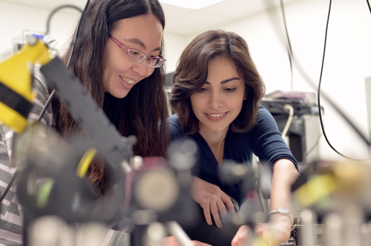 image: Ning Wang, the study's lead author, and Professor Mona Jarrahi working on the terahertz detector setup.