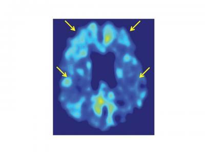 An FDDNP brain scan of an individual with mild cognitive impairment illustrates the parietal and frontal regions of the brain (see arrows) that have significant relationships to cognitive function. The lateral temporal lobe was another significant region, but is not included in this brain section.