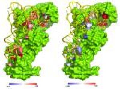 Crystal structure of glutaminyl tRNA synthetase (GlnRS, green) in complex with its substrate tRNA^Gln (yellow). Left panel: Color-coded residues depict favorable (blue) and unfavorable (red) effects on the free energy of glutamine binding from mutation at this position. Right panel: Effects of mutation on the ability of GlnRS to catalyze amino acid attachment to the tRNA. In this case all effects are unfavorable.