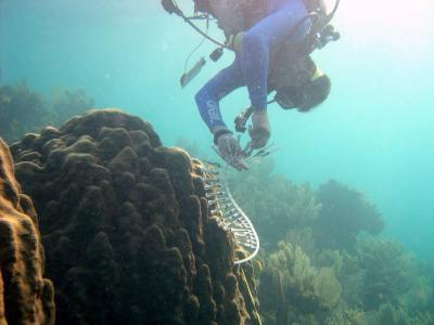 Dustin Kemp, a postdoctoral associate in the University of Georgia Odum School of Ecology, takes samples of a healthy Orbicella faveolata coral in the Caribbean.