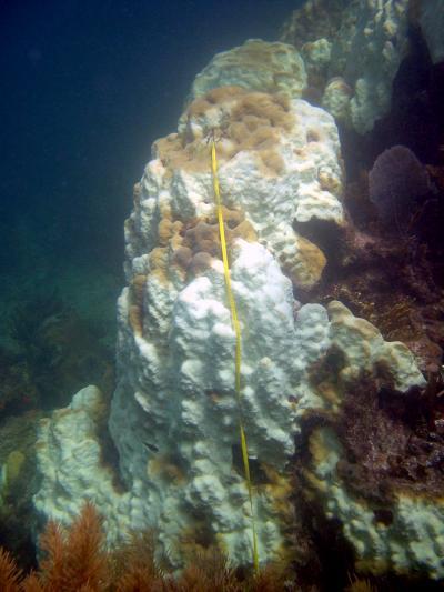 Researchers sampled Orbicella faveolata coral colonies in the Caribbean along marked transects seasonally from 2007-2010. This coral shows evidence of bleaching after an episode of high water temperatures.