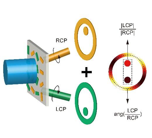 The metasurface generates two overlapping holographic images, one that is left-handed circularly polarized (LCP) and another that is right-handed circularly polarized (RCP). Circularly polarized light features an electric field oscillation plane that rotates to the left or right in a plane perpendicular to the direction of the wave.