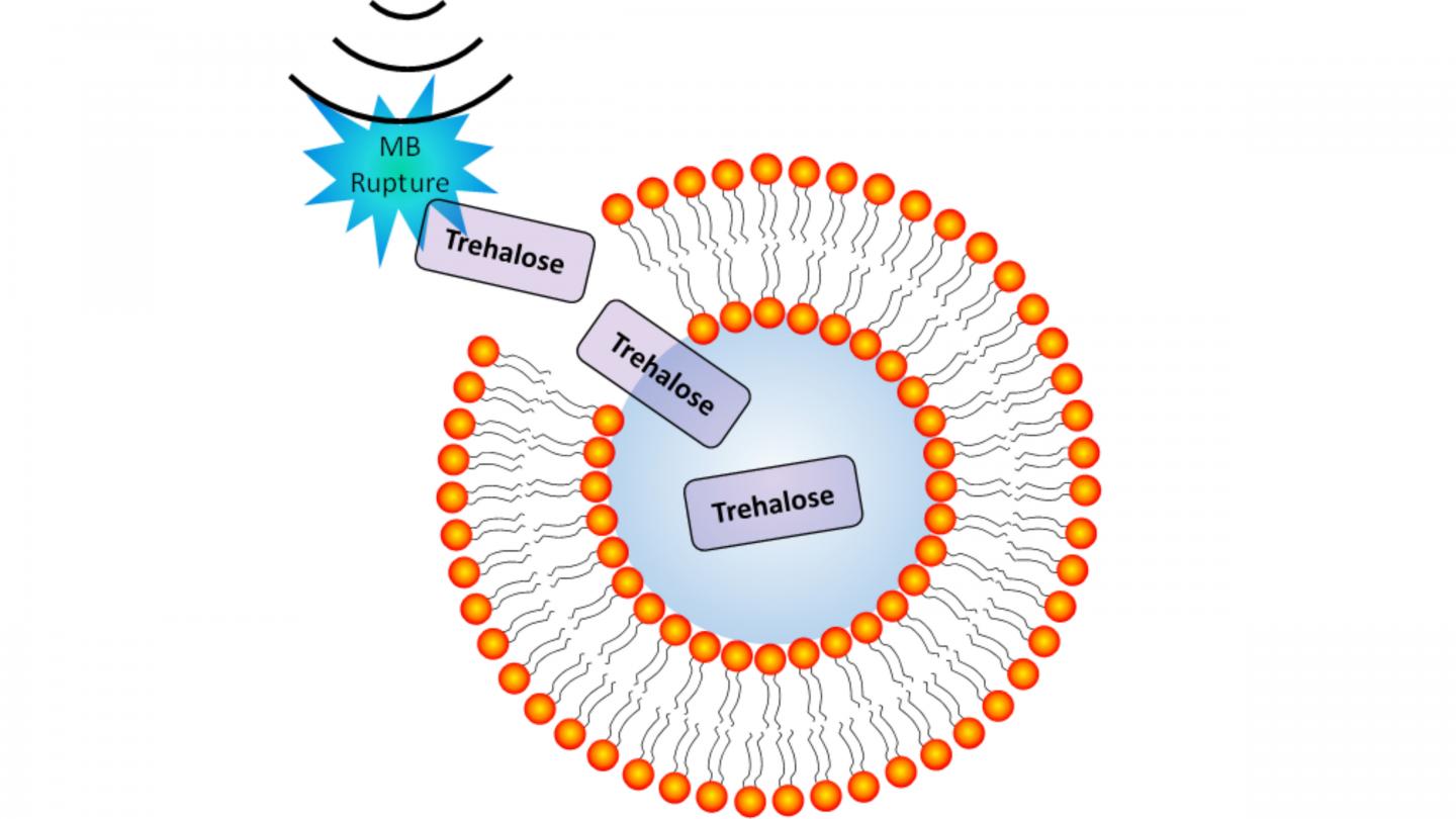 image: Illustration of ultrasound-induced microbubble (MB) rupture causing temporary pores in cell membranes, which enables entry of soluble molecules such as trehalose (not to scale).