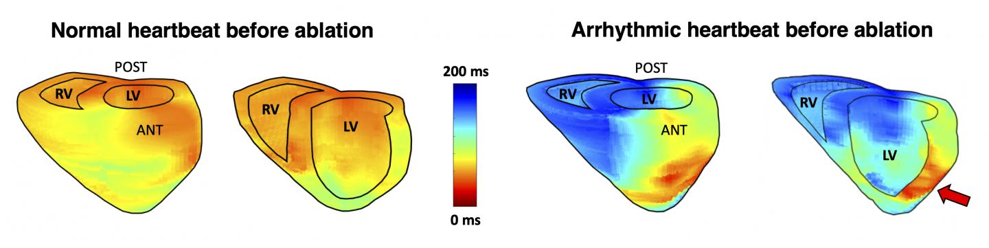 image:Â Electromechanical wave imaging (EWI) activation maps are capable of localizing the arrhythmic origin and differentiating irregular beats (right) from consecutive normal sinus rhythm beats (left) on the same patient before ablation. Red illustrates early and blue represents late activation (in milliseconds). The red arrow indicate the earliest activated region displayed by EWI, which successfully corresponds to the source of the arrhythmia in agreement with the site that was ablated with the intracardiac ablation site.LV = left ventricle, RV = left ventricle, ANT = anterior, POST = posterior.