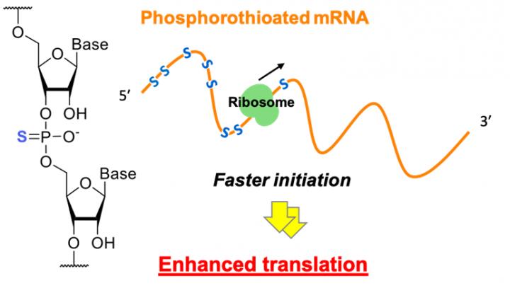 image: Phosphorothioate modification of mRNA increases the rate of translation initiation and the molecular designs for a high translation efficiency were optimized. This result provides a useful molecular design guideline for improving the translation quantity by chemical modification of mRNA.