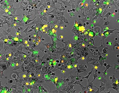 Cells infected with the KSHV virus fluoresce yellow. The KSHV virus remains dormant in more than 95 percent of infected patients.