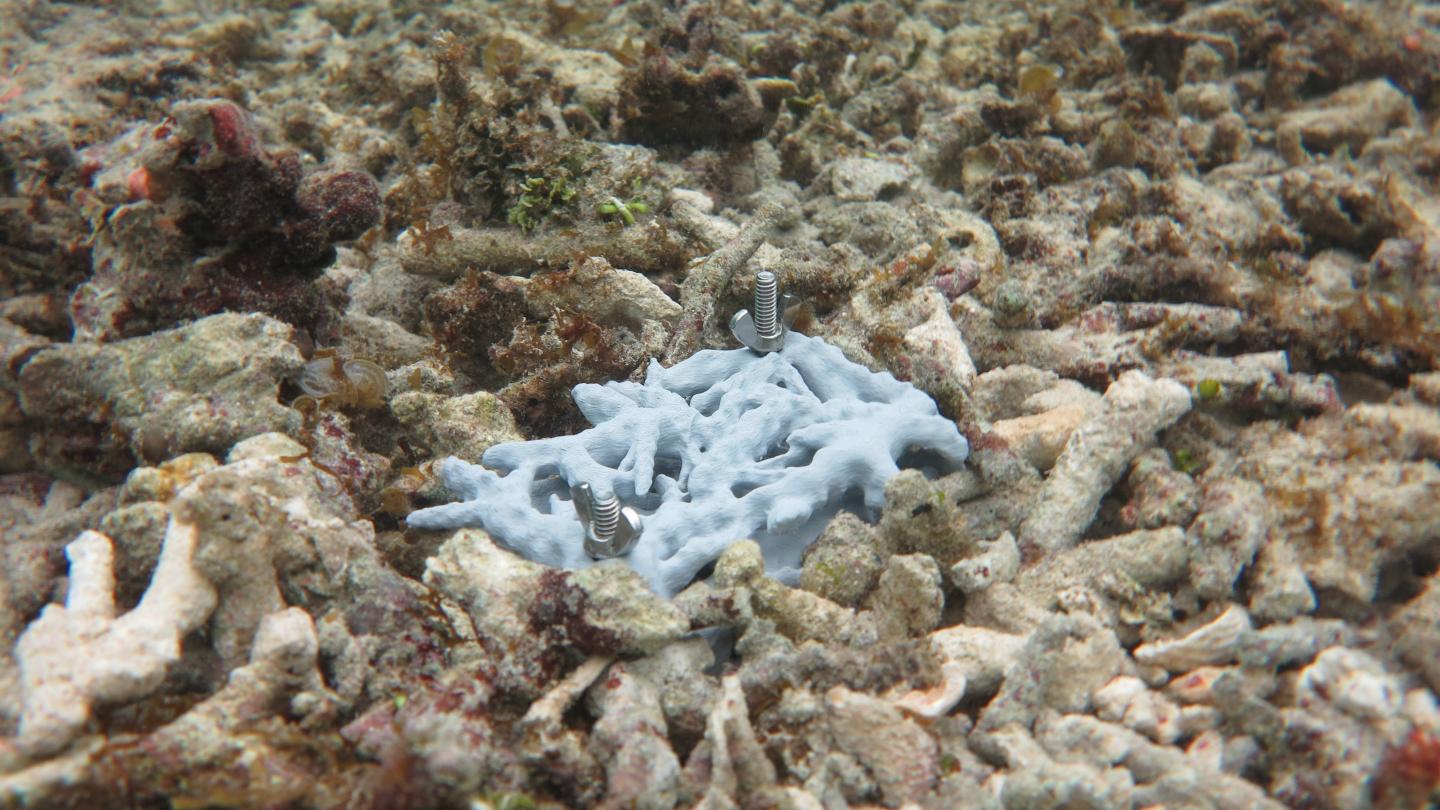The 3D-printed 'coral' mimics the surrounding reef rubble, seamlessly inviting hidden reef organisms to be unknowingly monitored.