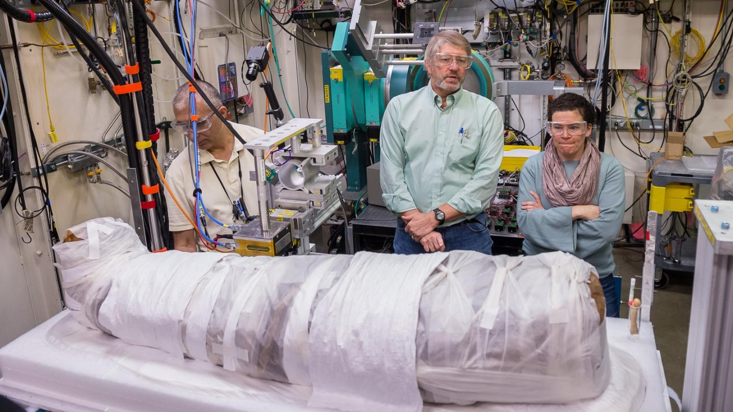 image: In 2017, Stuart Stock, center, of Northwestern University, talks with Rachel Sabino, right, of the Art Institute of Chicago while Argonne scientist Ali Mashayekhi, left, makes adjustments to the apparatus holding a 1,900-year-old Egyptian mummy.