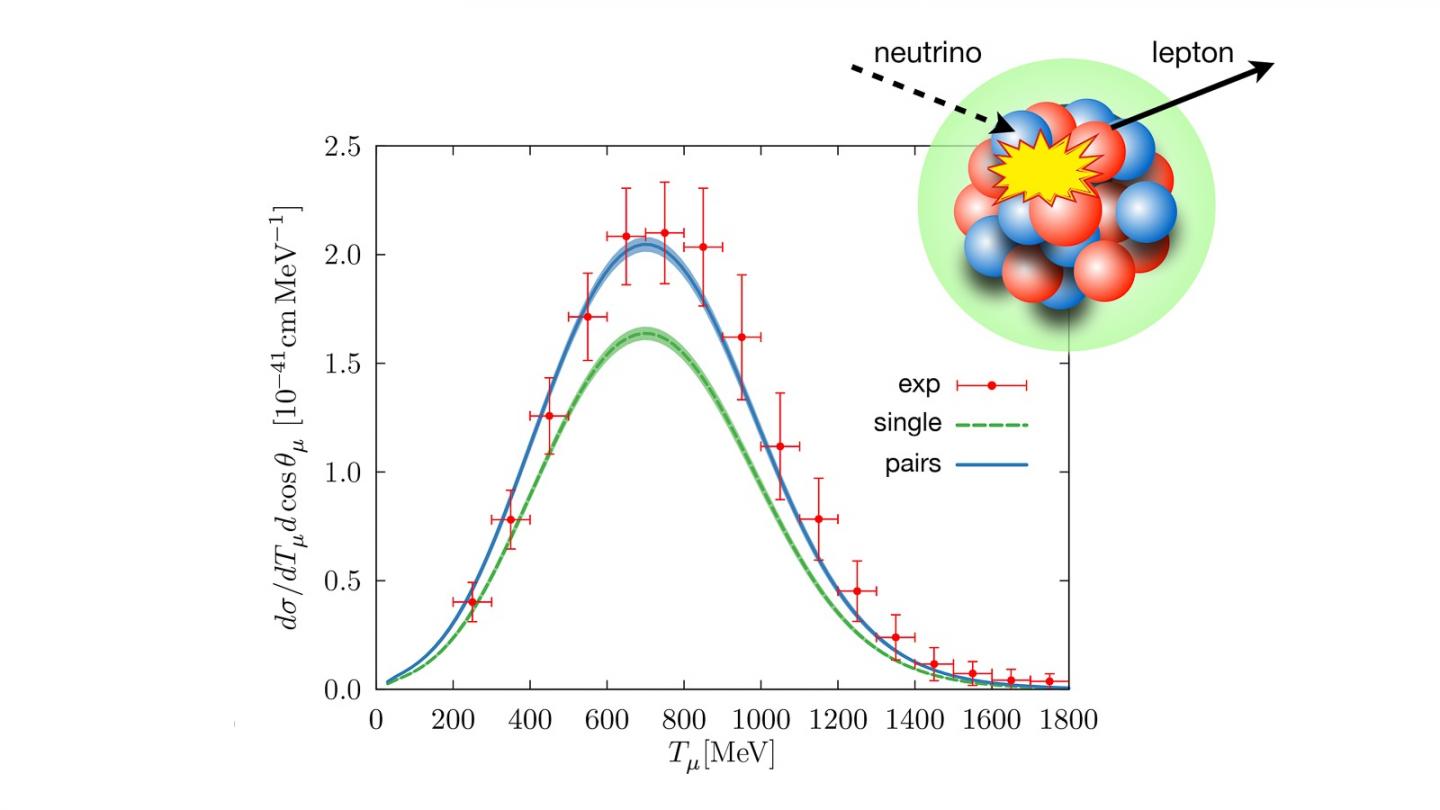 image: Cross sections of neutrino-nucleus interactions versus energy. Improved agreement between experiment and model calculations clearly shown for case of nucleon pair rather than single nucleon. Inset shows neutrino interacting with nucleus and ejecting a lepton.