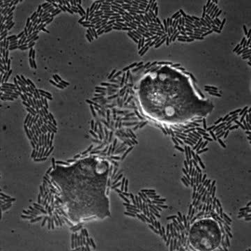 The video above, captured during a span of 113 minutes, shows that Pseudomonas (gray tubes) grow exponentially -- doubling their numbers roughly every 30 minutes -- and establish large populations of cells over the course of a few hours. In contrast, eukaryotic organisms such as the amoeba (large organisms) grow much more slowly and can be quickly overwhelmed by a bacterial population. The bacteria's ability to rapidly multiply in a variety hosts makes a Pseudomonas infection difficult to treat using antibiotics.